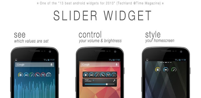 A small Widget that gives control of the screen brightness and the sound volume directly from your home screen. You can easily manage those with the widget's slider or your hardware buttons. With a double click, you can also use the buttons to toggle. Slider Widget shows 6 Categories (e.g brightness or ring volume), which you can choose from 7 categories (more below). You can also change the order of the categories displayed in Slider Widget.